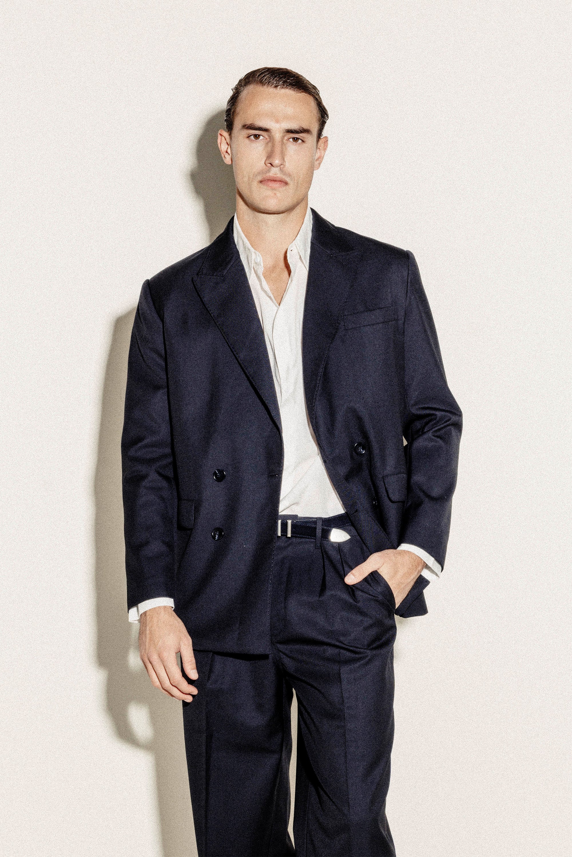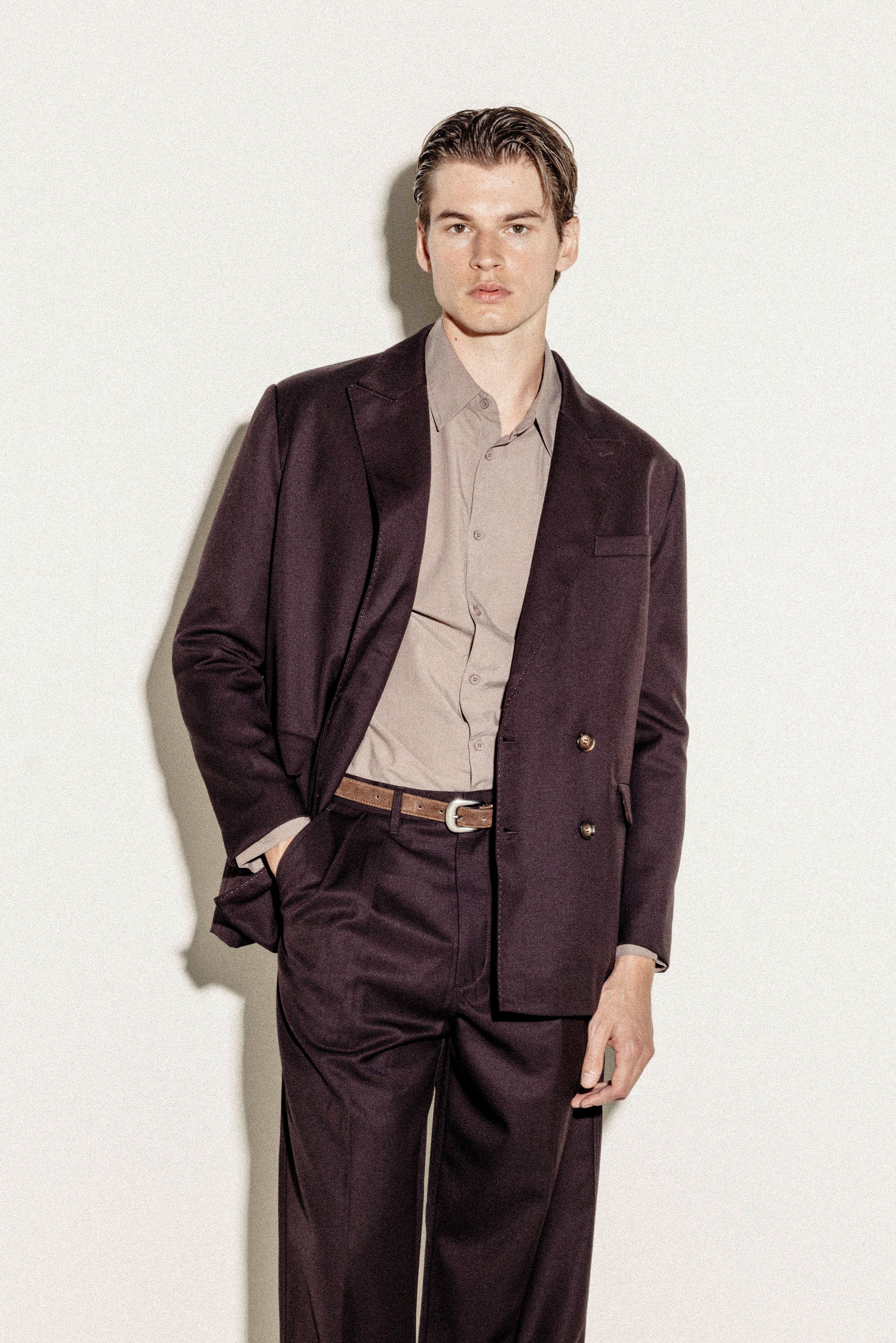 Our Double-Breasted Blazer in Dark Brown is a statement of confidence, inspired by 1990s formal wear. The slightly relaxed fit maintains sharp elegance, tailored with two overlapping panels in a premium wool blend. Pair it with our Relaxed Pleated Trousers for a true 90s Wall Street look, or dress it down with Bootcut Denim Jeans for an elevated everyday outfit.