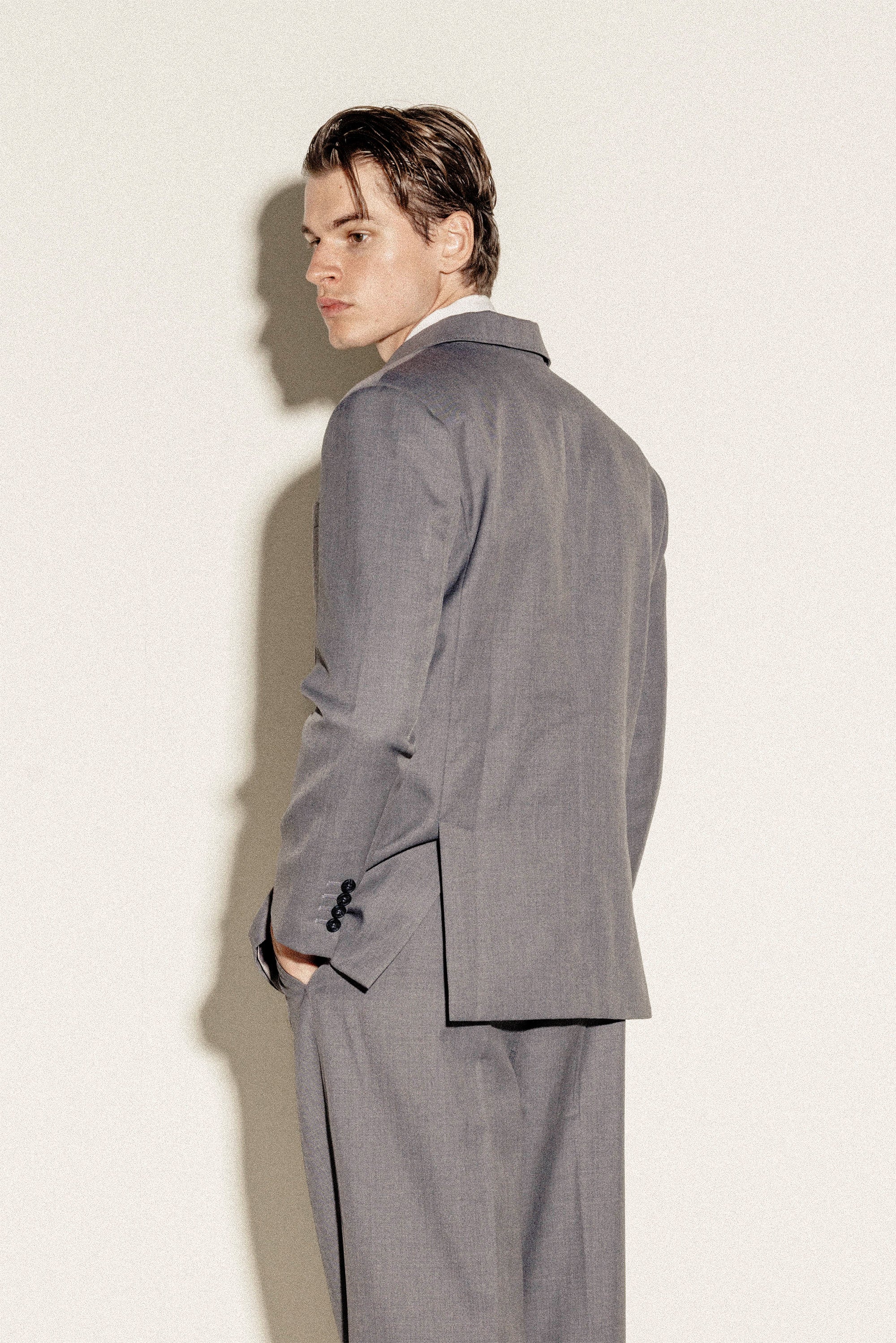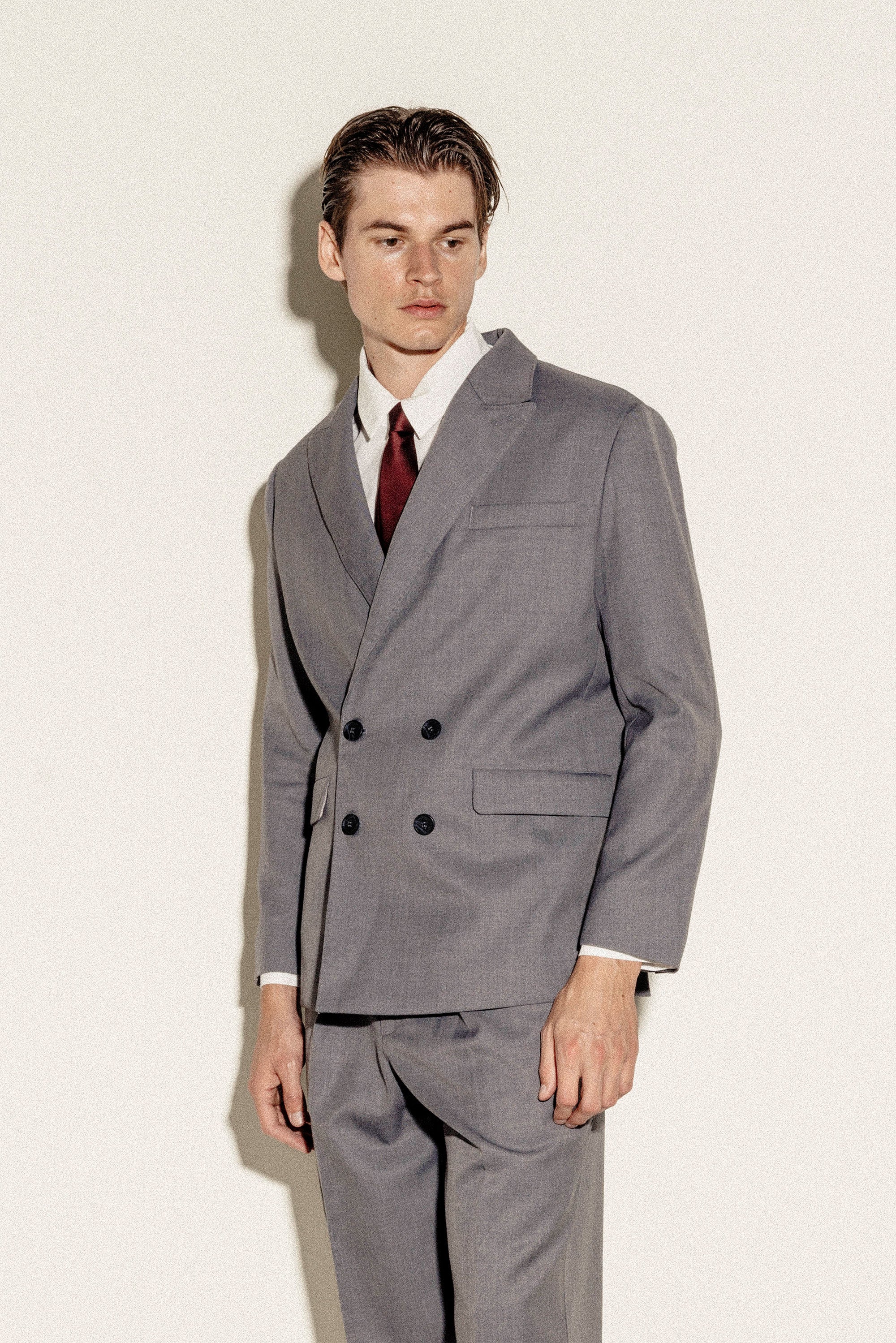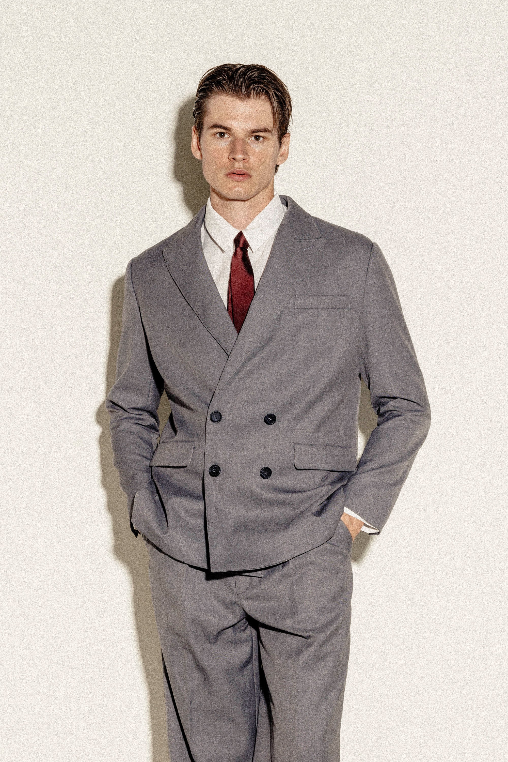 Our Double-Breasted Blazer in Grey is a statement of confidence, inspired by 1990s formal wear. The slightly relaxed fit maintains sharp elegance, tailored with two overlapping panels in a premium wool blend. Pair it with our Relaxed Pleated Trousers for a true 90s Wall Street look, or dress it down with Bootcut Denim Jeans for an elevated everyday outfit.