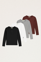 Our bestselling Henley Shirt, now available in a 4-pack featuring Black, White, Grey and Dark Brown.
