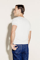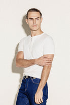 Our Henley Short Sleeve Shirt in White is a timeless essential, defined by our signature Henley silhouette with a four-button placket. Inspired by the slim fit shirts worn in the 1950s and 60s, it combines simplicity with a masculine edge.