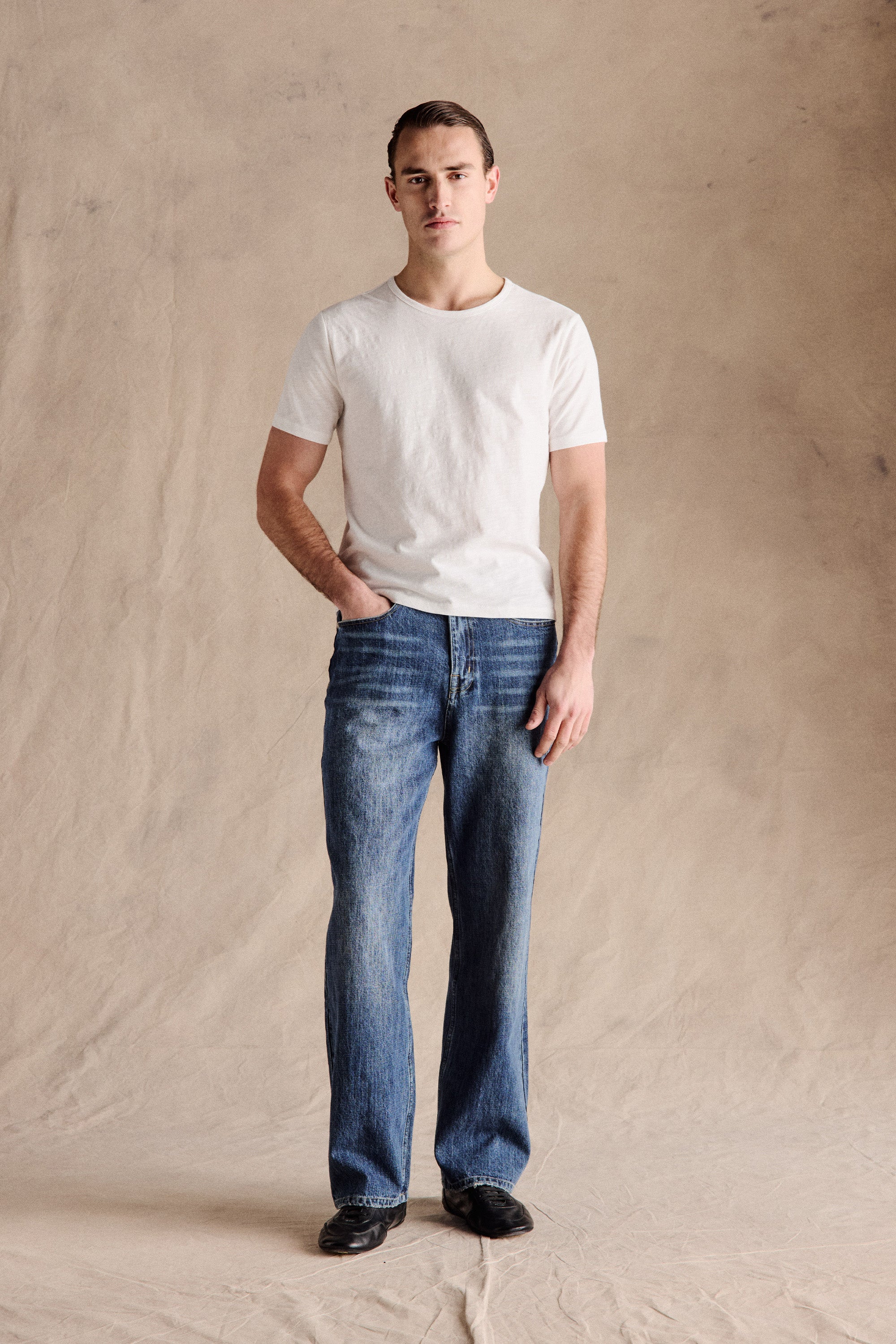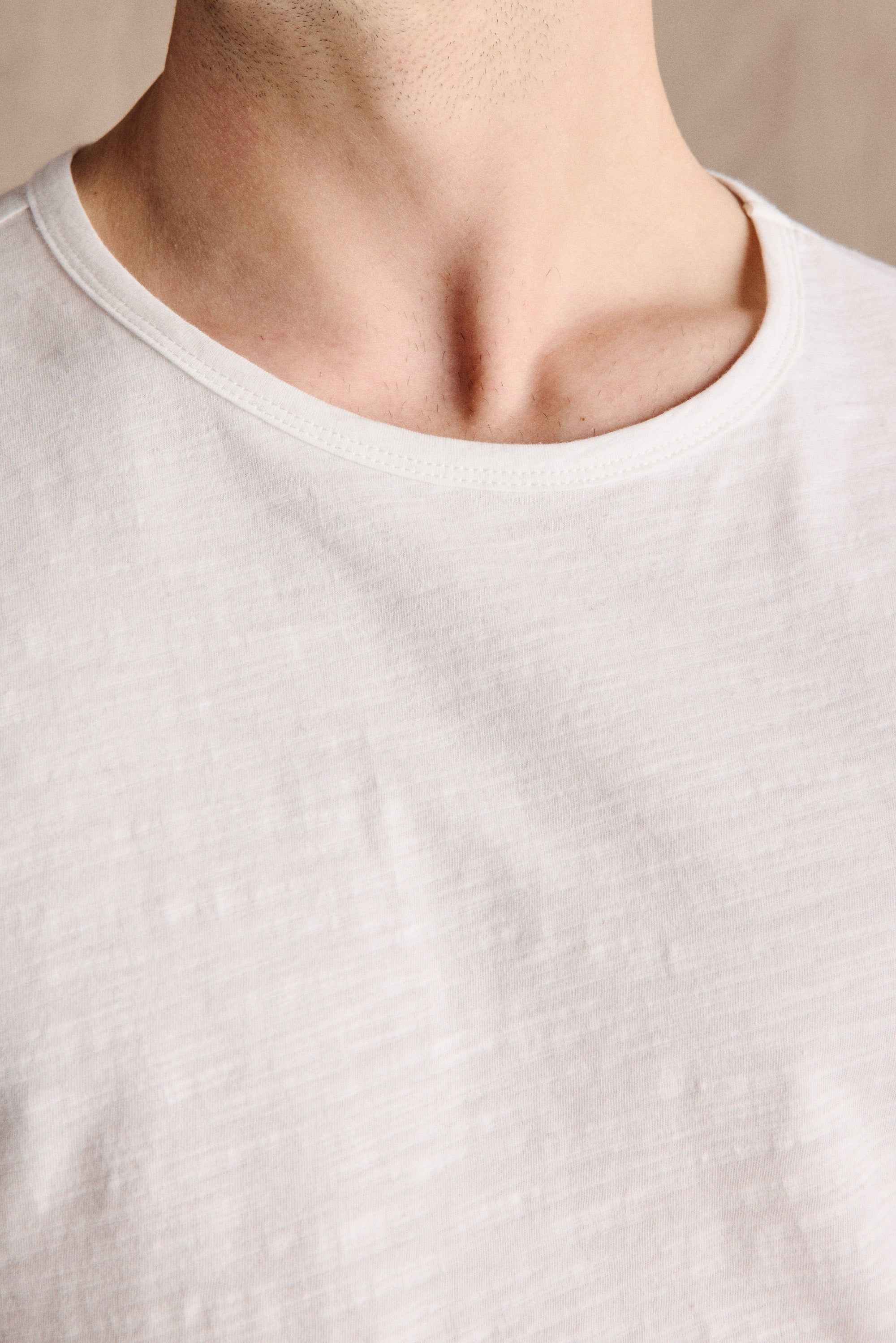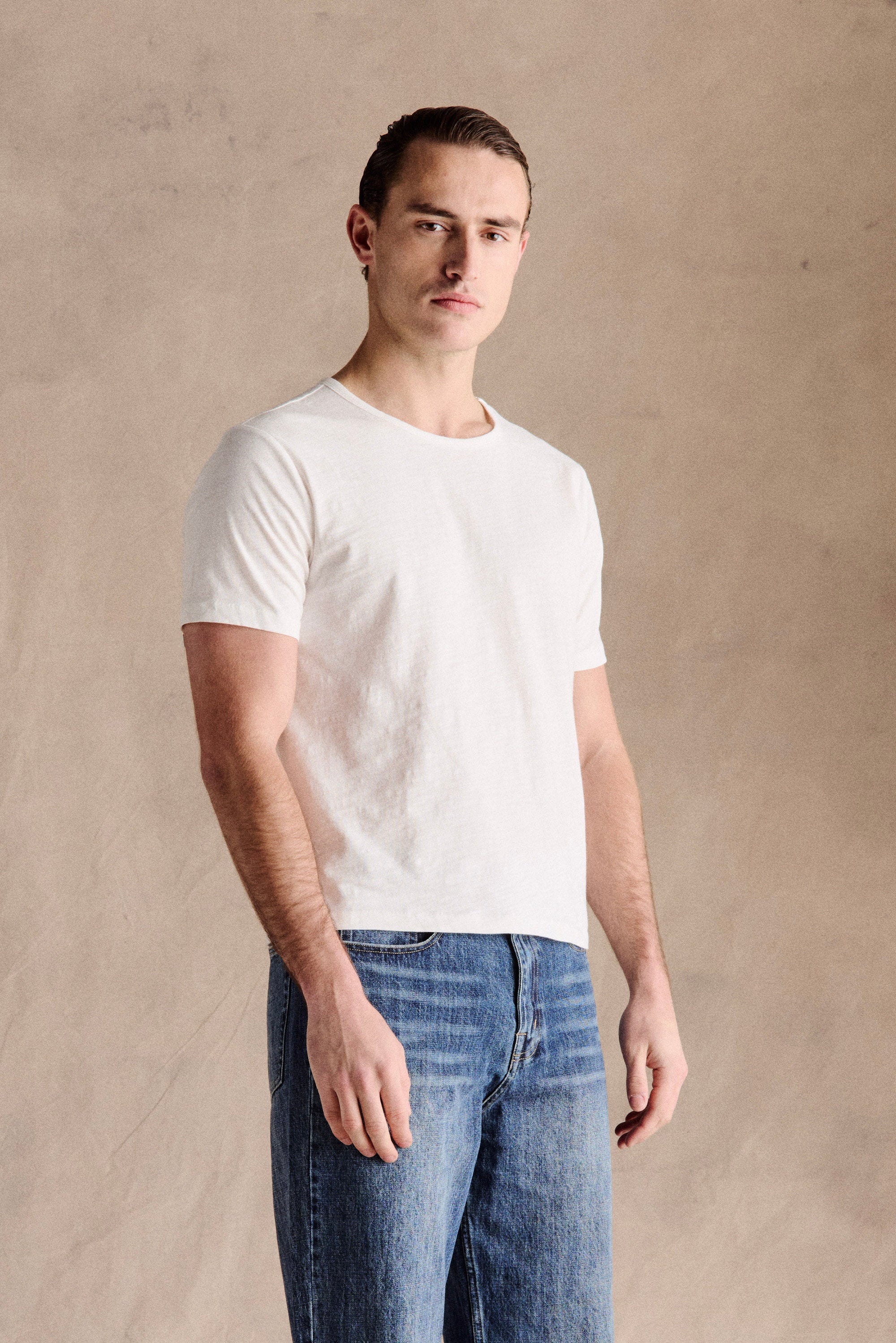 The Steve Slub Cotton Tee in White is inspired by 1960s off-duty film icons like Steve McQueen and James Dean, who made simple essentials feel effortlessly cool. Our vintage T-shirt is made from 100% slub cotton and features a fitted, slightly cropped silhouette. The slub texture and single-stitched hems create an authentic, lived-in look and feel.