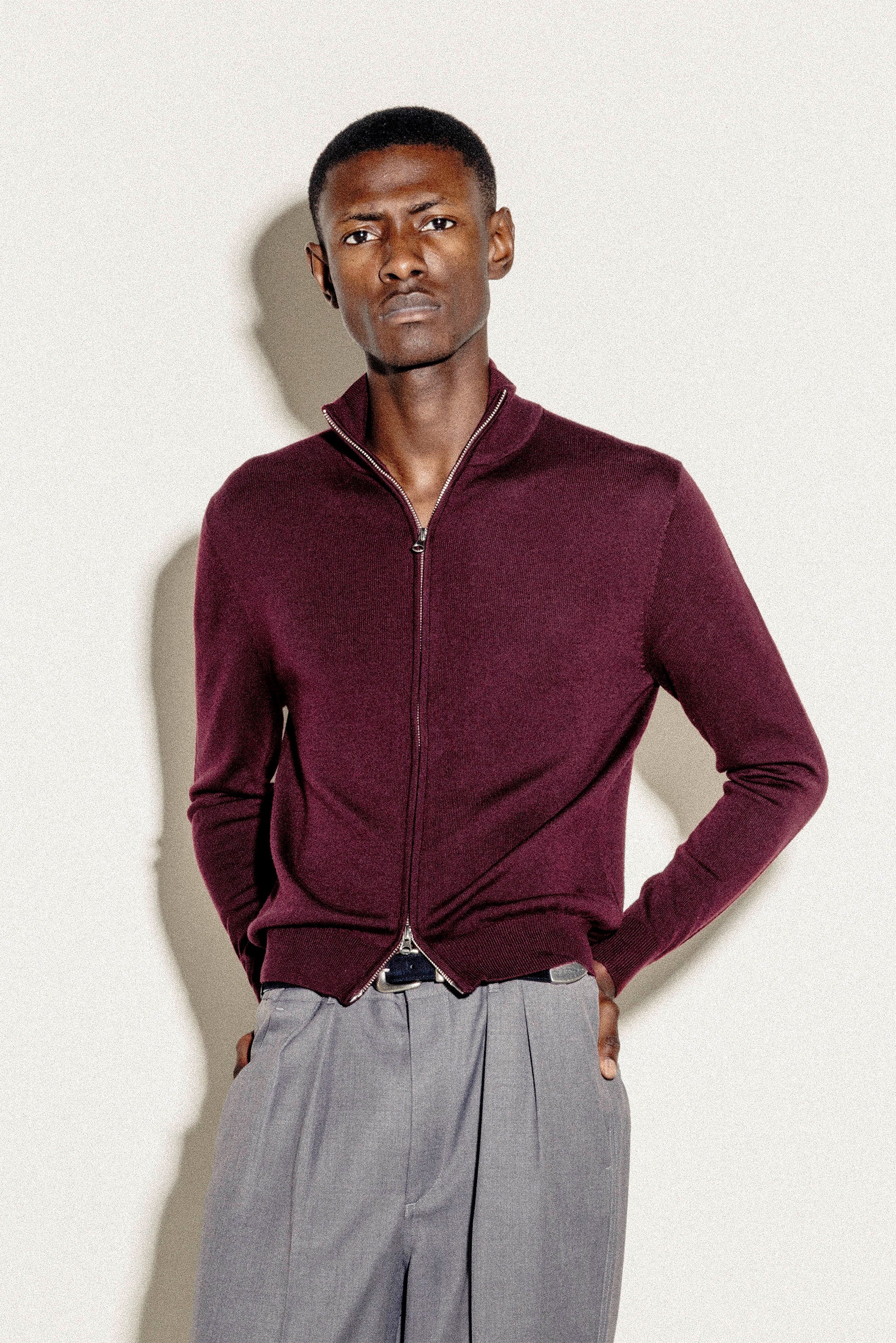 Our Slim Zip Vest in Burgundy is inspired by the laid-back minimalism of the 1990s, recalling the easy, everyday style of the era.