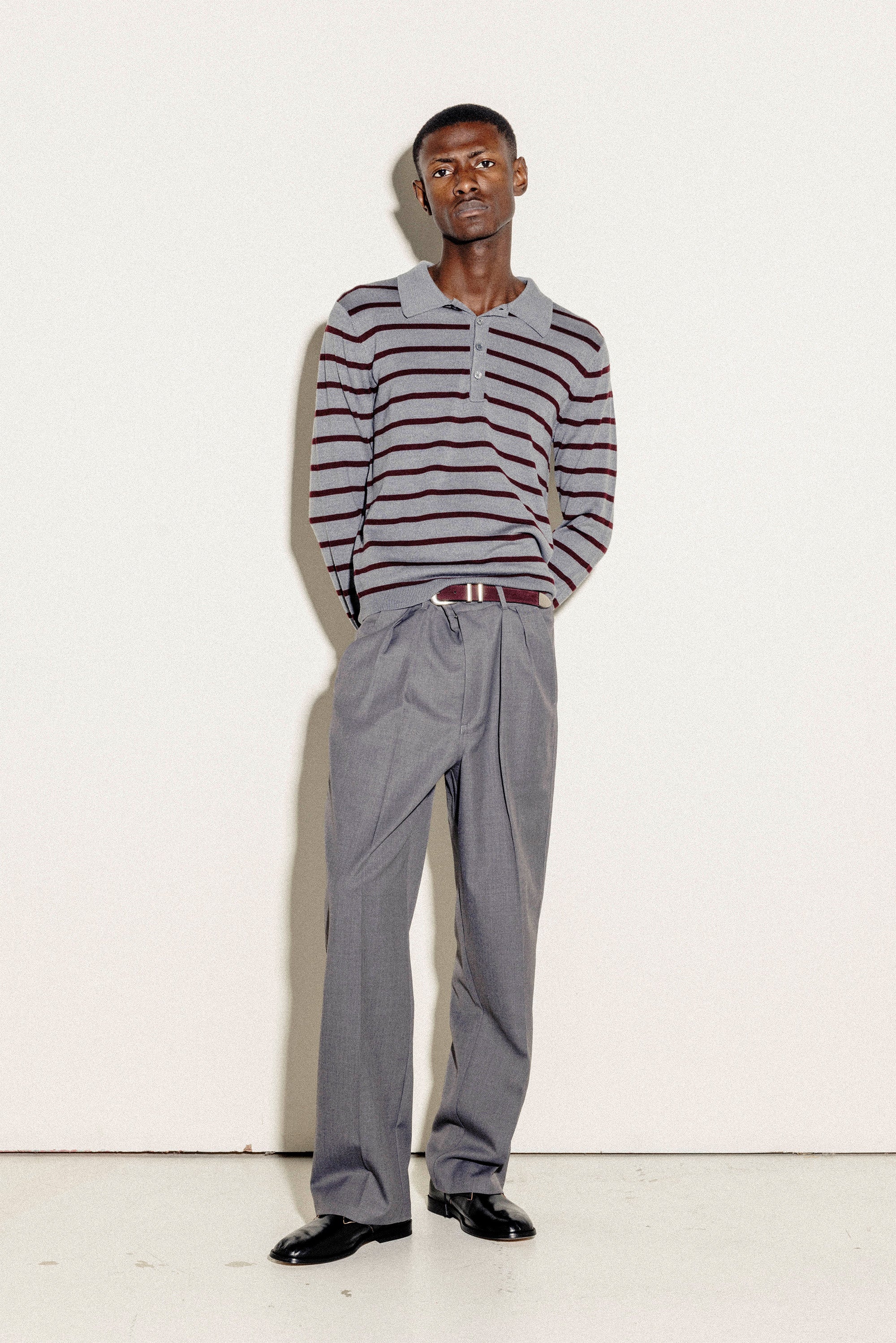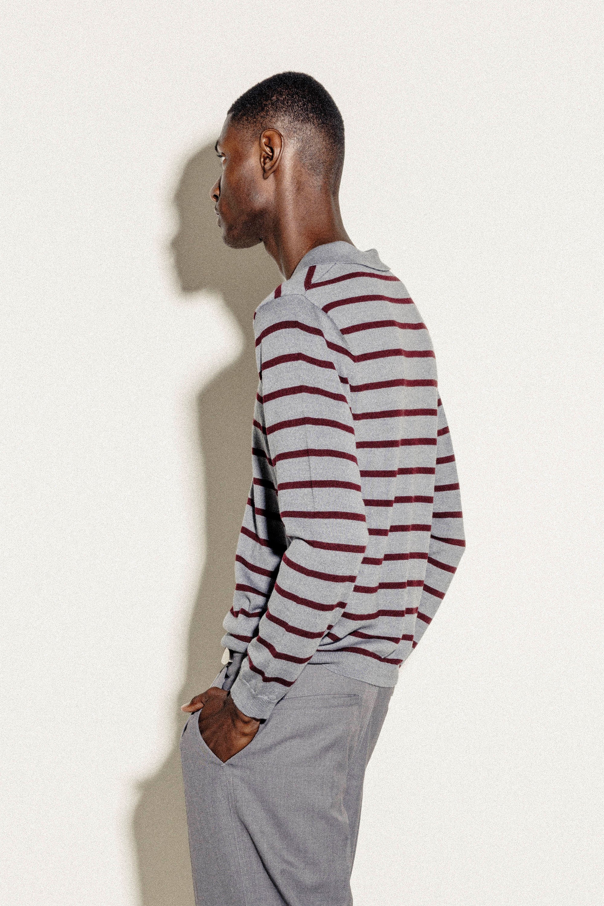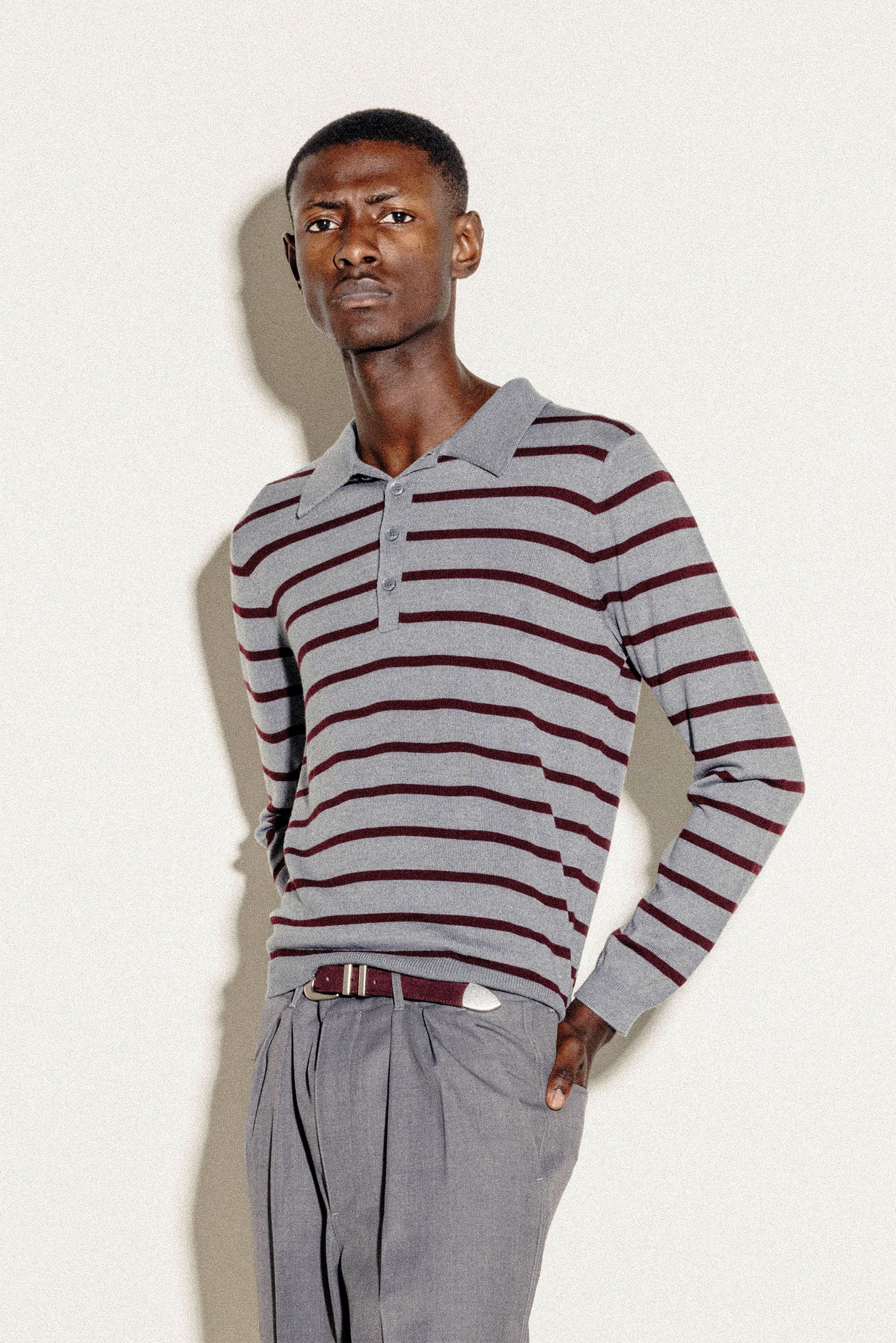 Our Striped Polo in Grey takes inspiration from the timeless 1950s style of James Dean, drawing on the classic Breton stripe first worn by the French Navy in the 1850s and later adopted by cultural icons. This classic design comes in Grey and Burgundy stripes, giving a subtle, modern twist to a heritage staple.